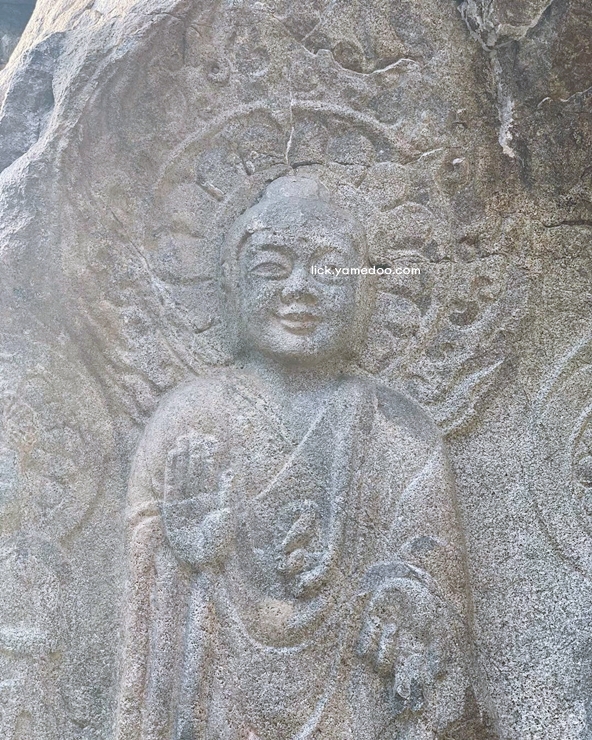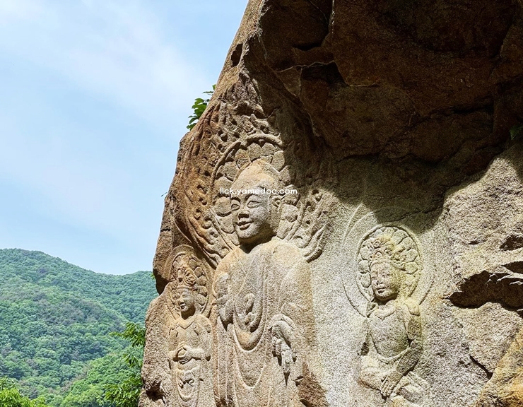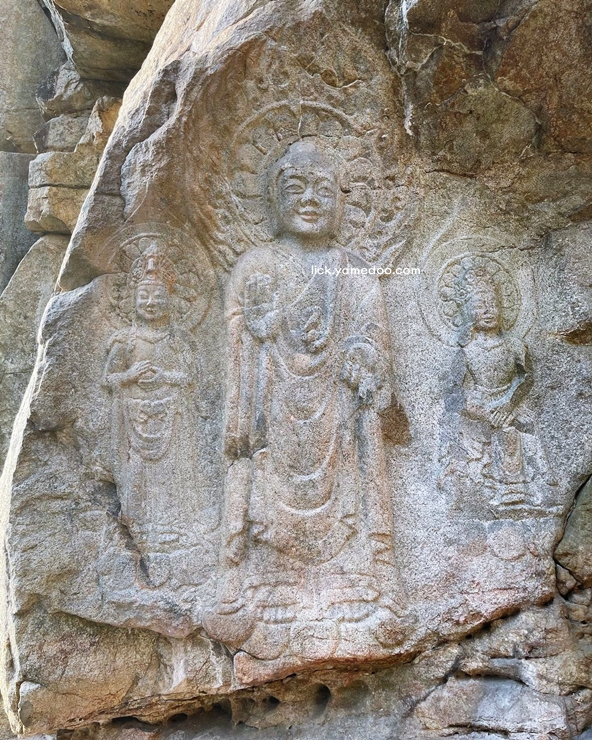 오전 시간에 방문하면 햇빛이 불상에 직접 비춰 그 미소를 더욱 뚜렷하게 감상할 수 있습니다. 특히, 중앙의 여래상은 풍만한 얼굴에 자애로운 미소를 띠고 있어 보는 이로 하여금 평온한 느낌을 줍니다. 좌측의 보살상은 보주를 들고 있으며, 우측의 반가사유상은 특유의 자세로 새겨져 있습니다.