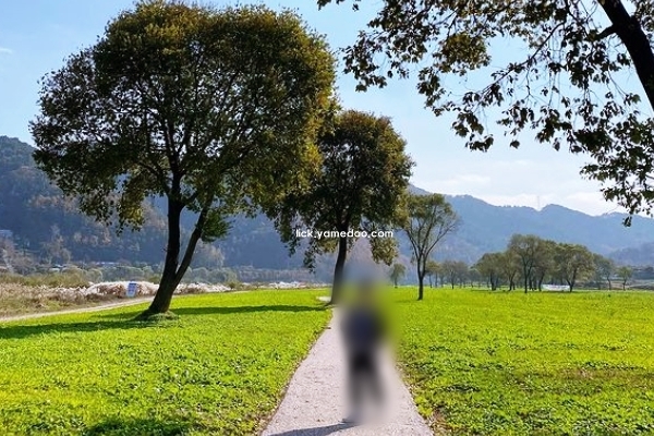 강변을 따라 조성된 산책로는 걷기에 부담이 없고, 곳곳에 벤치가 있어 쉬어가며 풍경을 감상하기 좋습니다. 강물에 비친 하늘과 산이 어우러진 모습이 고요하면서도 평온한 느낌을 줍니다.
