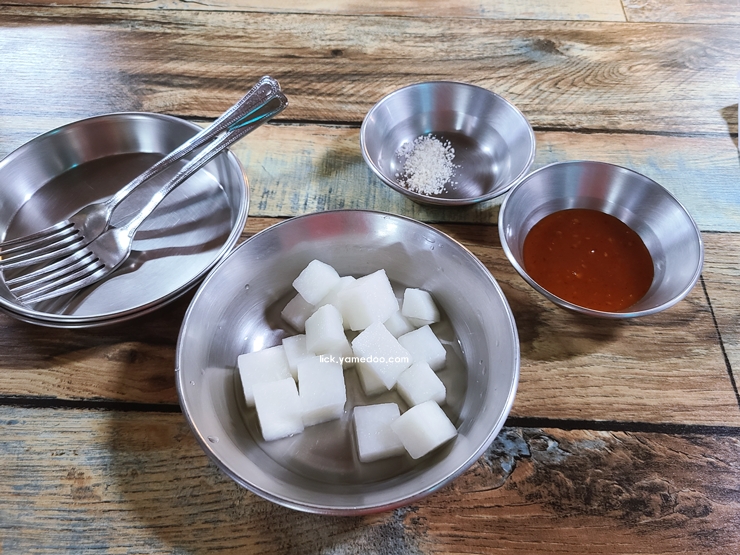 양동통닭은 간단한 메뉴 구성으로 치킨 자체의 맛에 집중할 수 있게 되어 있습니다. 기다리는 동안 치킨무와 소금, 양념 소스가 먼저 나왔는데, 투박한 그릇들이 옛스러운 느낌을 자아내더군요. 치킨이 나오기 전부터 설레는 기분이 들었습니다.