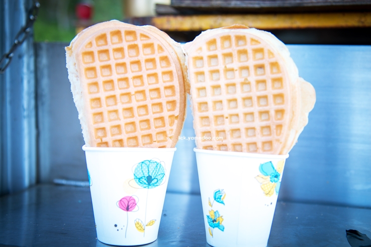 정동진 해변에서는 이렇게 자연을 감상하는 것 외에도 간단하게 즐길 수 있는 먹거리들이 많습니다. 해변을 따라 걷다가 와플 가게에서 따뜻한 와플을 하나 사 먹었는데, 종이컵에 꽂아주는 방식이 인상적이었습니다.