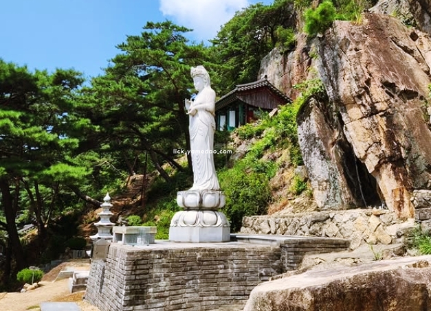 정방사에 오르기 전부터 길가에 핀 들꽃들이 반겨주는 듯했습니다. 산길은 조금 가팔랐지만 주변 풍경이 아름다워 힘든 줄 몰랐습니다. 절에 가까워질수록 나무 사이로 불상과 전각이 하나둘 모습을 드러냈습니다.