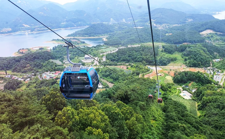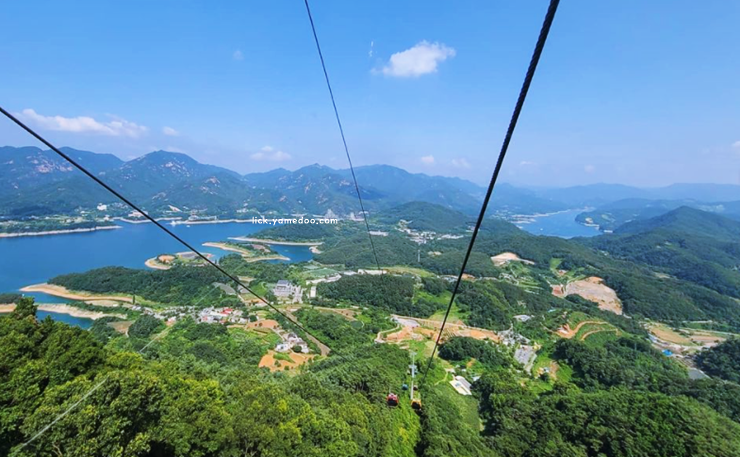 물빛은 햇살을 받아 반짝였고, 그 위로 비치는 하늘이 그림 같았습니다. 케이블카 안에서는 모두가 말없이 풍경을 바라보며 감탄을 나눴습니다. 정상에 도착하니 전망대에서 바라보는 제천의 전경이 탁 트여 있었습니다.