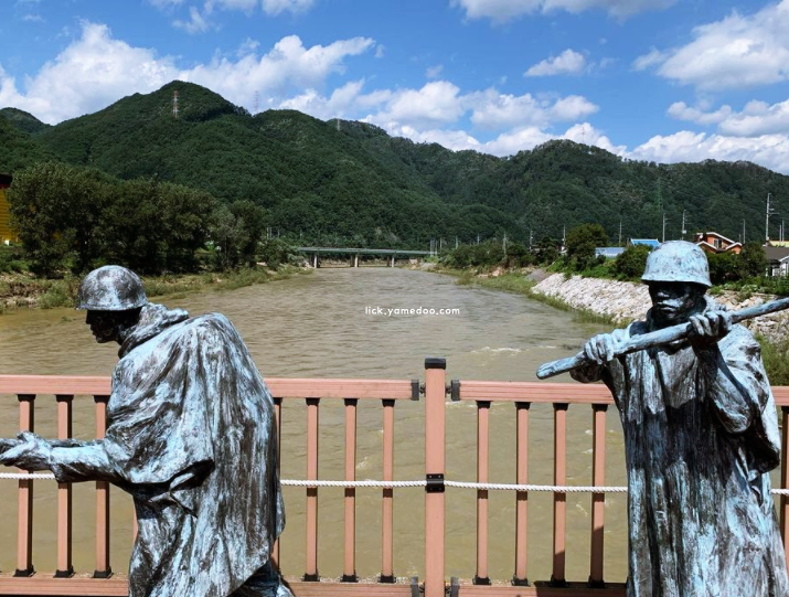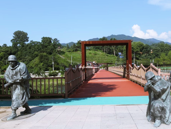 리빙스턴교에 도착하자 맑은 내린천 위로 길게 뻗은 붉은 다리가 눈길을 사로잡았던 인제 가볼만한곳 베스트10이었습니다. 다리 입구에 서서 아래를 내려다보면 투명한 강물과 자갈밭이 그림처럼 펼쳐집니다. 걷기 시작하면 철재 바닥 틈 사이로 물이 보여 약간의 아찔함과 함께 설렘이 느껴졌습니다.