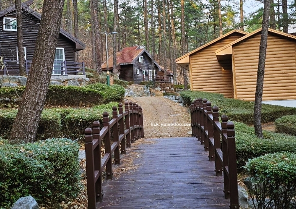 나무 그늘 아래로는 가족 단위로 온 사람들이 간단한 간식을 즐기며 웃고 있었습니다. 산속 숙소 건물은 주변 풍경과 잘 어우러져 조용히 자연 속에 스며들어 있었습니다.