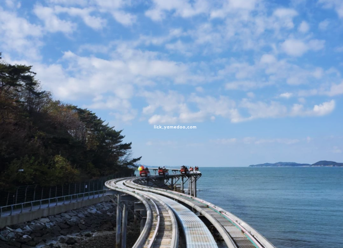 스카이바이크 탑승장에 도착하니 바다 위로 길게 뻗은 철로가 먼저 눈에 들어온 충남 가볼만한곳 베스트10 여행지 입니다. 출발하자마자 발밑으로 펼쳐진 푸른 바다가 시원하게 다가왔습니다.