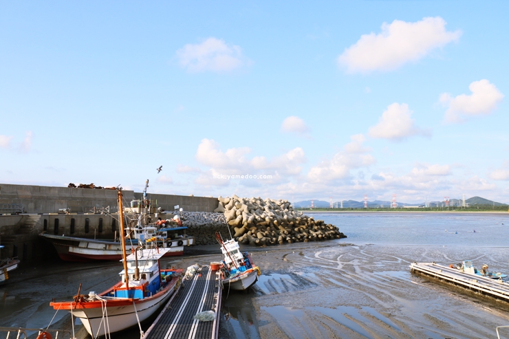 구시포항에 도착하자 바다 내음이 먼저 반겨주고, 파도는 조용히 방파제를 두드리고 있었습니다. 항구에는 고깃배들이 나란히 정박해 있었고, 배 위에서는 어민들이 그물 손질에 한창이었습니다.